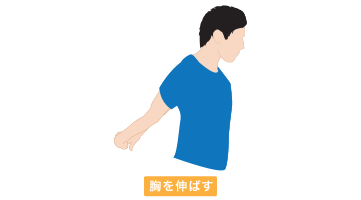 - 背中の後ろで両手を組み、その両手を上にあげ、同時に胸を張ります。少しきついくらいのところで10秒間キープします