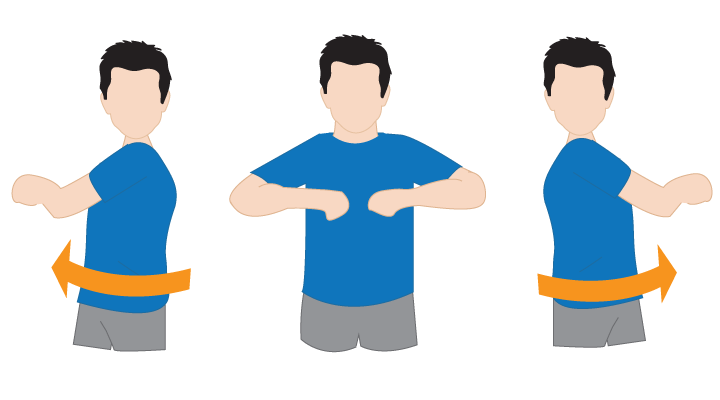 正面を向いて、頭は動かさずに首から下を大きく回します。腕を大きくふることを意識すると良いです。仕事の合間に1分間行うと、首周りの筋肉がストレッチされ、頭痛の予防・改善効果が期待できます。
